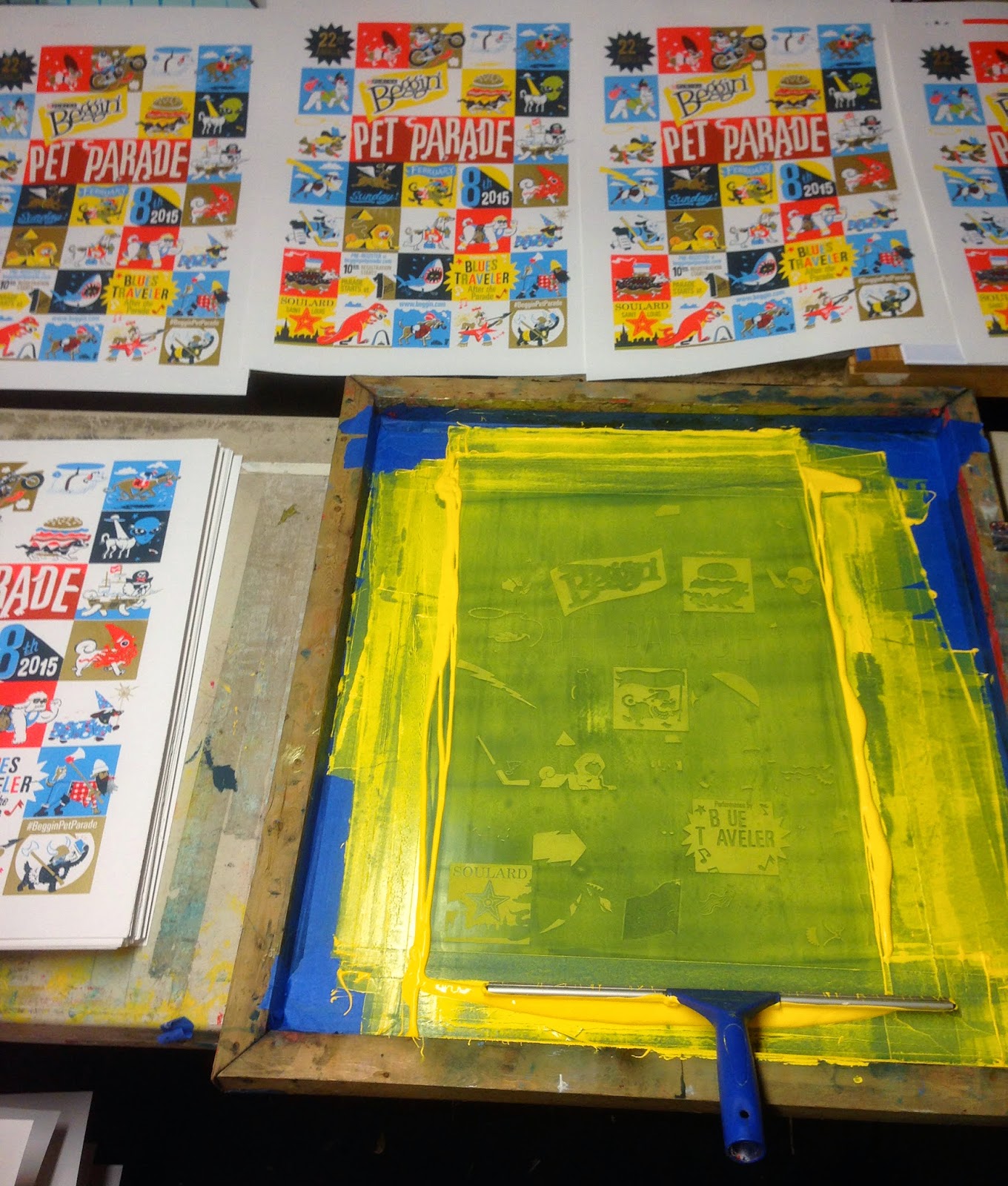 5-color hand-pulled screenprint for the 2015 Beggin' Pet Parade in the Soulard neighborhood of St. Louis. Light blue, dark blue, semi-fluorescent red, yellow & metallic gold on 18"x24" Canson Edition (250 gsm) paper.