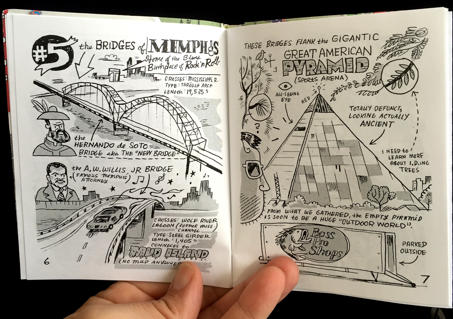 32-page 4.5" x 5.5" mini-comic about a roadtrip I took with my wife in Sept. 2012. Top 5 Bridges, Fried Chicken Joints and Museums are showcased, along with a big centerfold map and laffs along the way. Screenprinted covers, unique found map endpapers, xeroxed interiors.