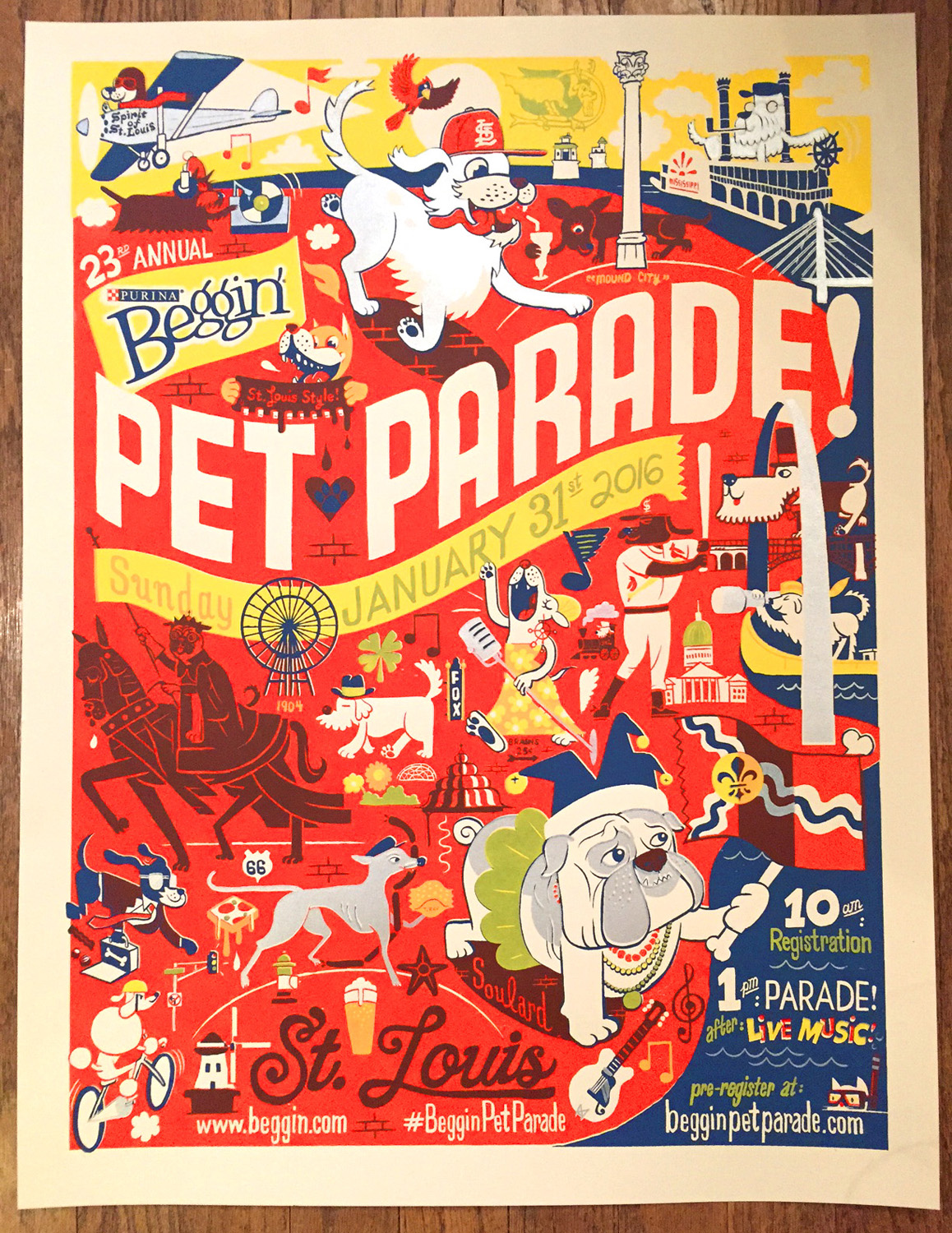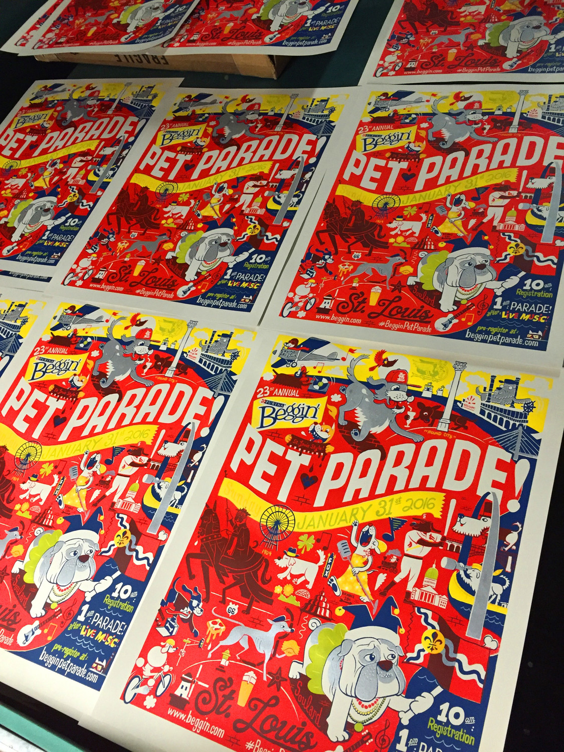 4-color hand-pulled screenprint for the 2016 Beggin' Pet Parade in the Soulard neighborhood of St. Louis. Navy blue, red, yellow and silver ink on 19"x25" French (80 lb) paper.