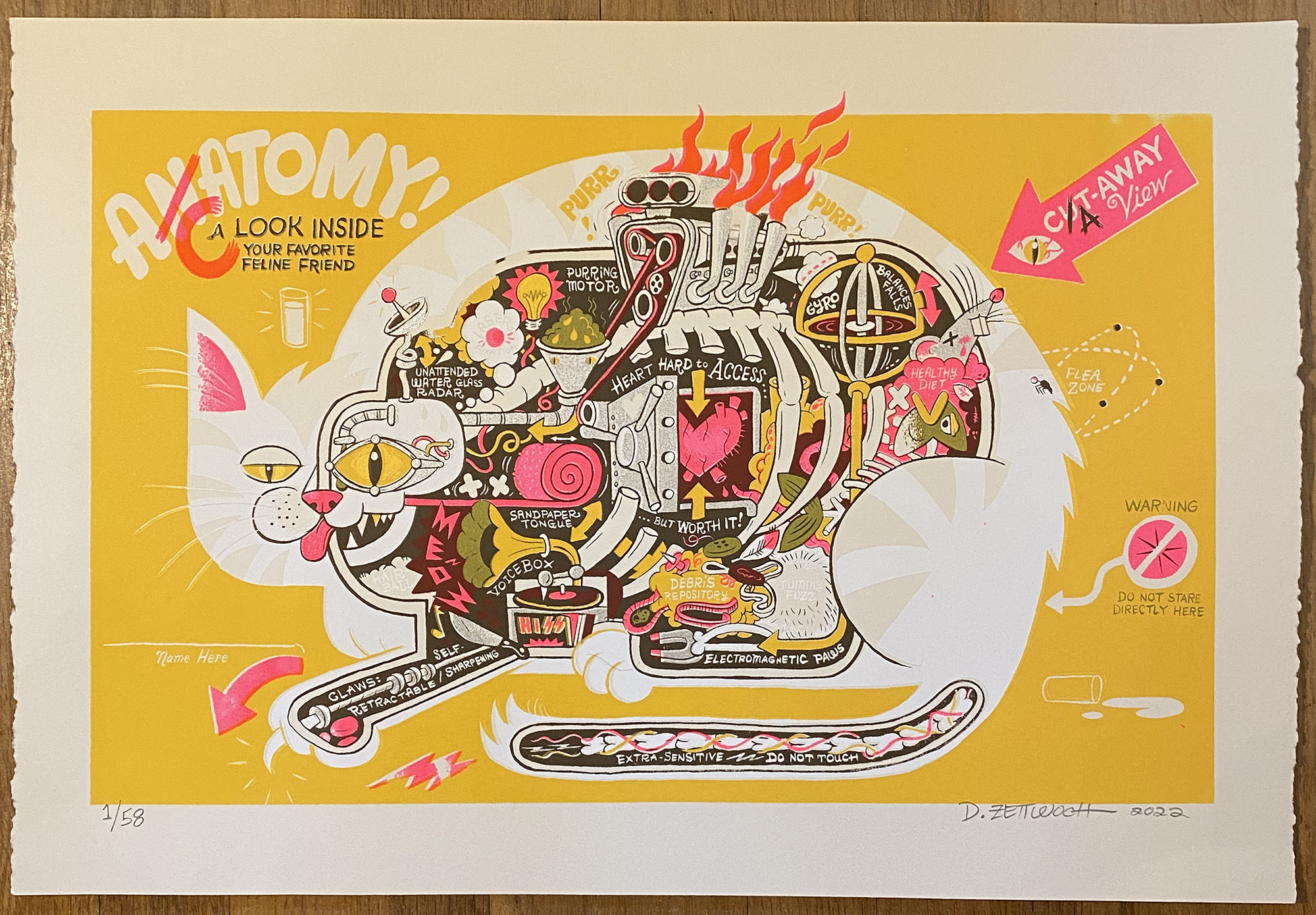 5-color hand-pulled screenprint providing "A Look Inside Your Favorite Feline Friend". Yellow, White, Brown, Silver and Fluorescent Pink ink (brighter than it looks here) on 22" x 15" 90lb Stonehenge paper. 100% accurate.