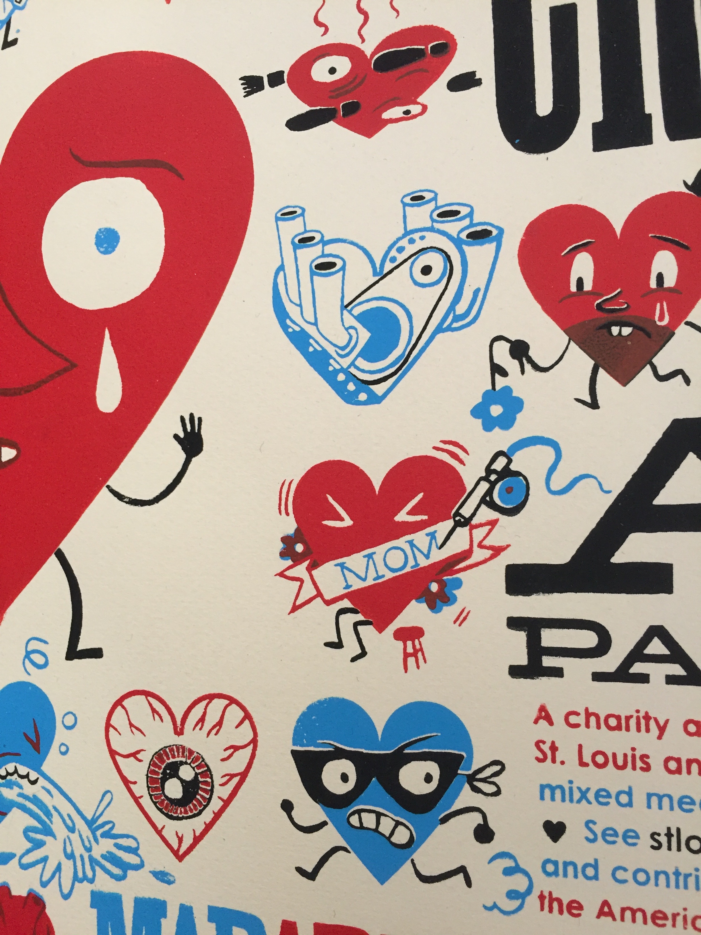 3-color hand-pulled screenprint filled with heart. Black, Red and Blue ink on 18" x 18" Canson mi-tientes wheat paper. Xoxo. More info here: http://zettwoch.blogspot.com/2010/02/lovecrushartparty-new-bleeding-ink.html