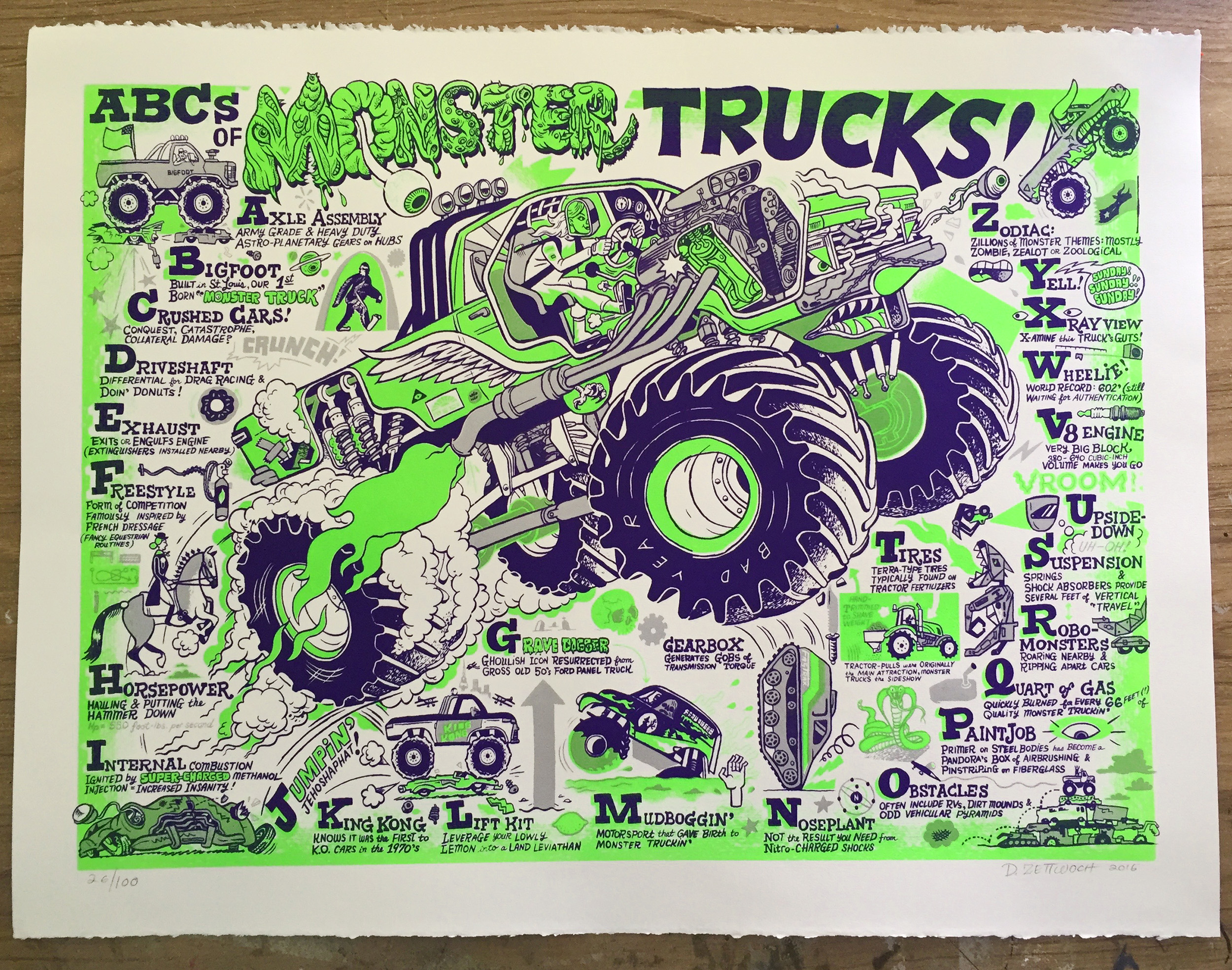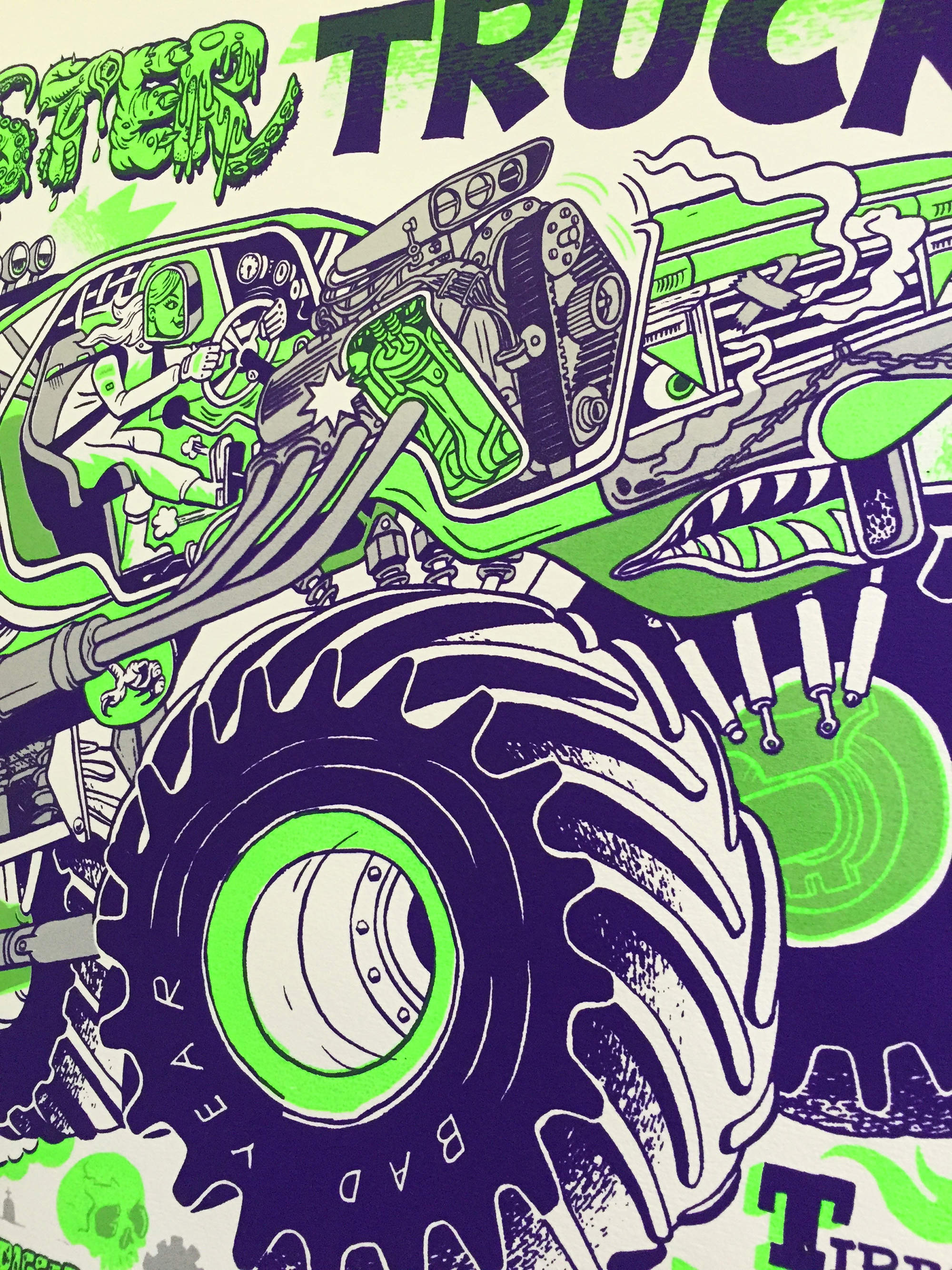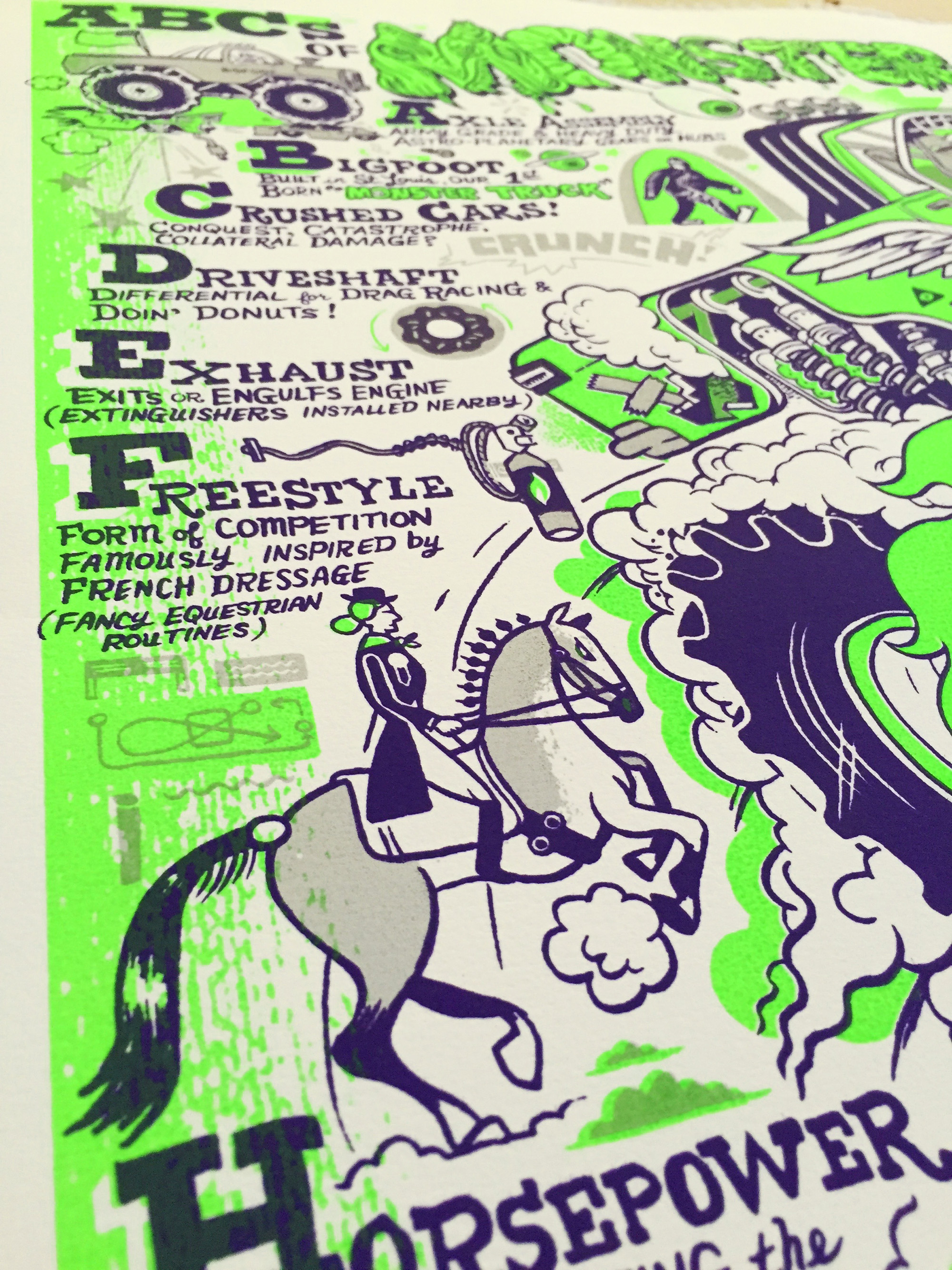 Huge 3-color screenprint depicting the alphabetical ins and outs of a typical Monster Truck. Purple, Silver and Fluorescent Green on 30" x 22" Canson antique (250 gsm) paper. Historically and mechanically accurate for all ages.