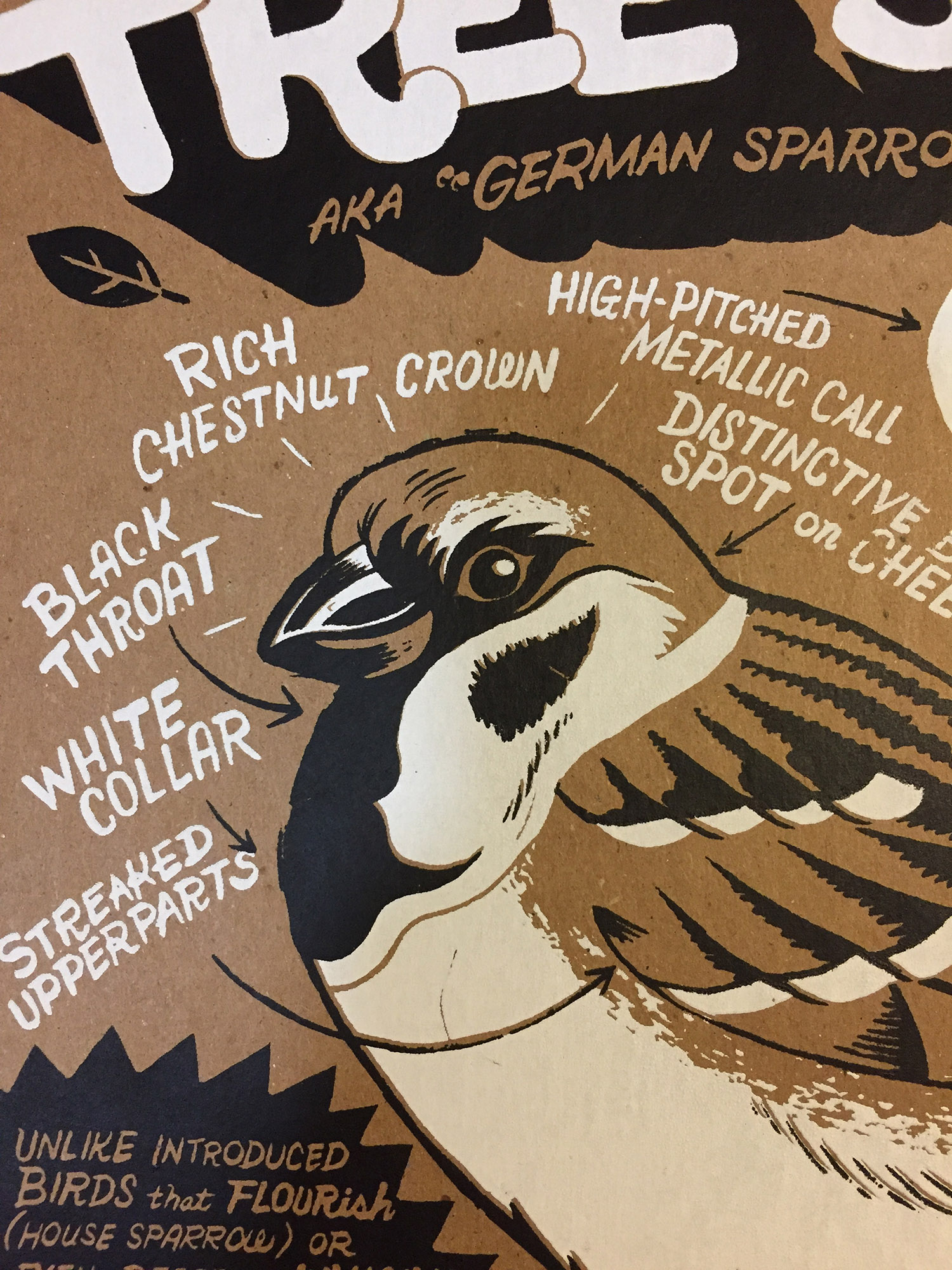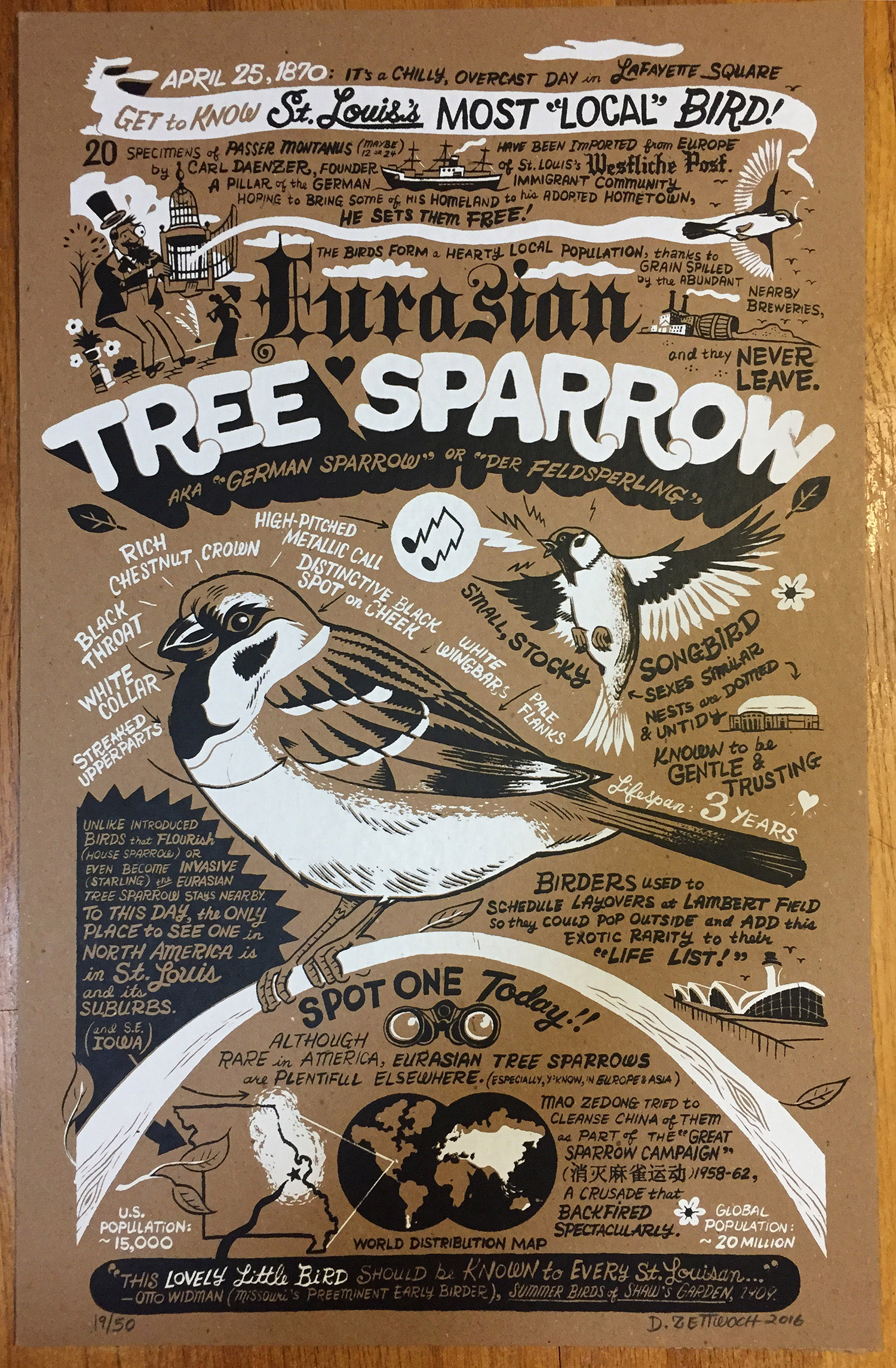 2-color screenprint depicting "St. Louis's Most Local Bird", the lovely little Eurasian Tree Sparrow. Black and White ink on 14 x 22" chipboard. Entirely factual. The only place to see an "ETS" in North America is in the St. Louis metropolitan area... or on this print!