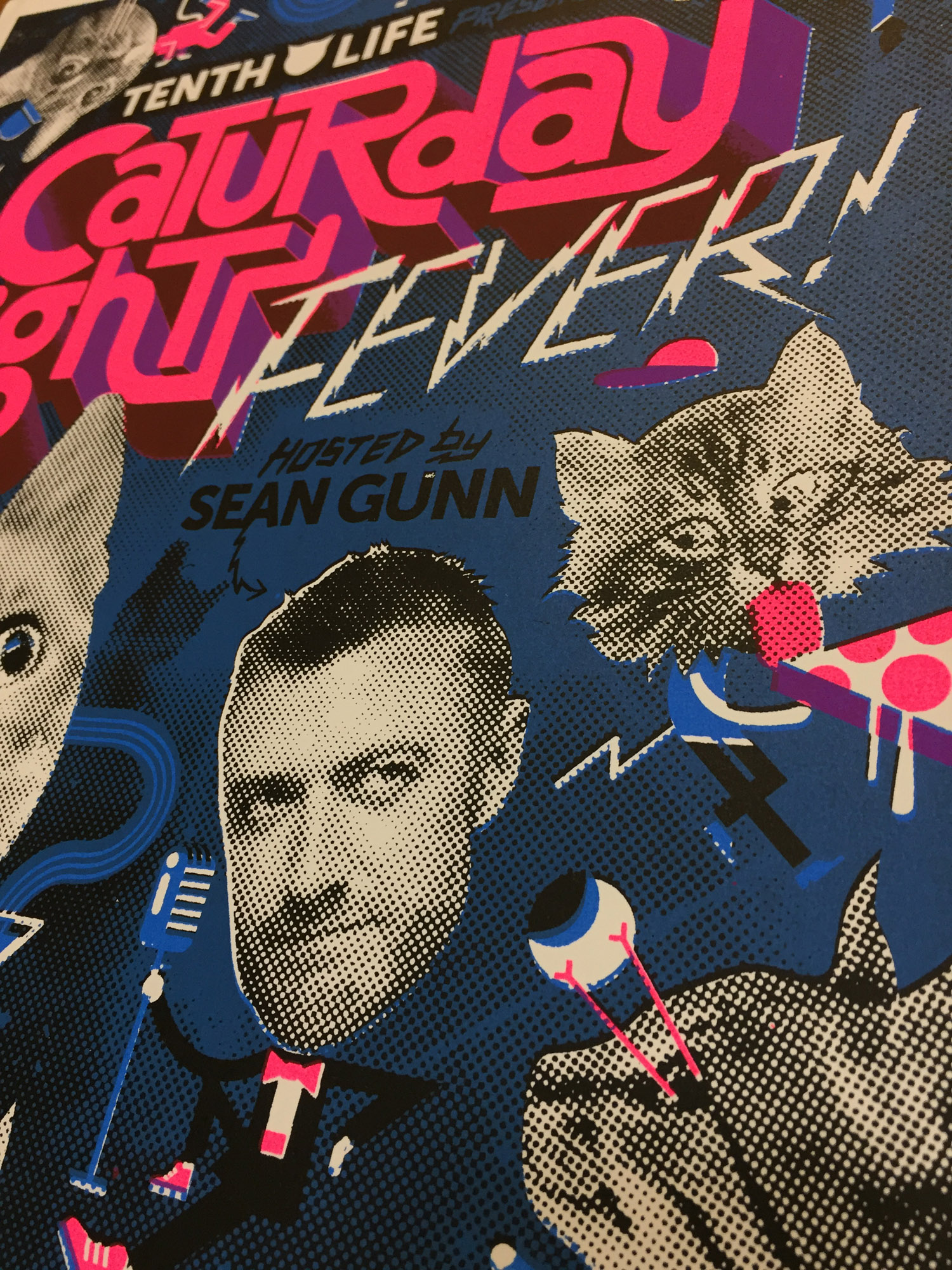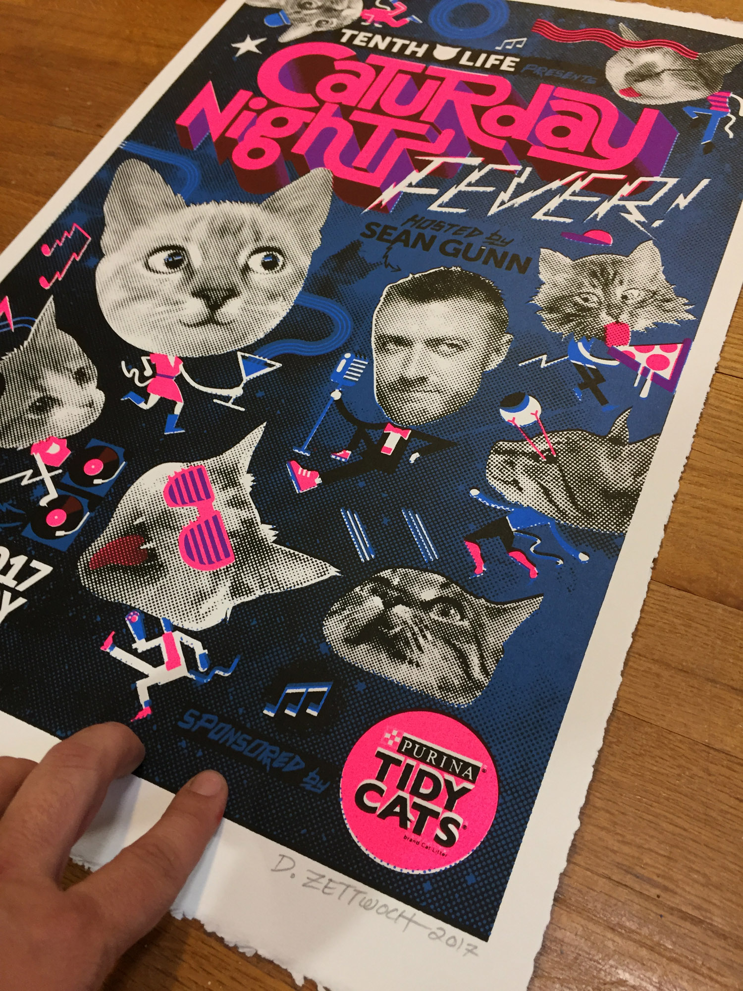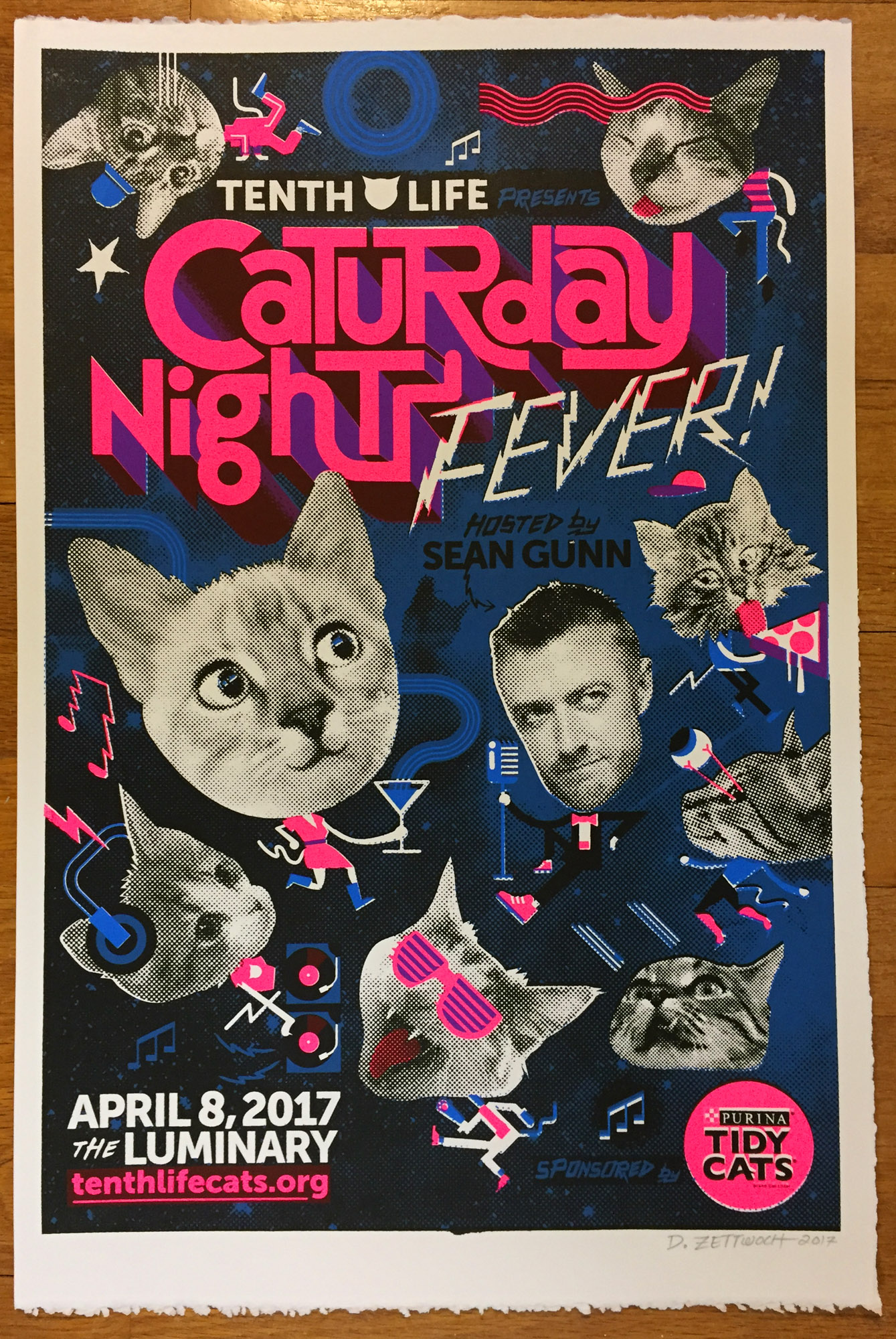 3-color screenprint produced for Tenth Life Cat Rescue, April 2017. Black, blue and fluorescent pink on 14.875 x 22.75" Canson antique white (250 gsm) paper. Portion of proceeds go to tenthlifecats.org