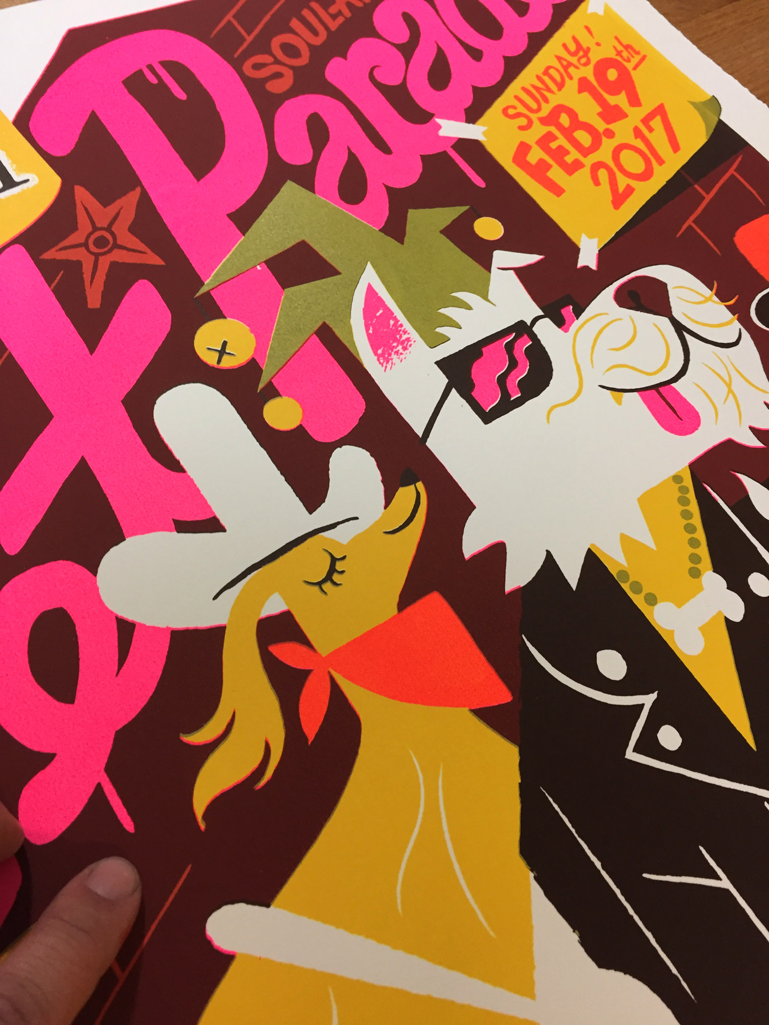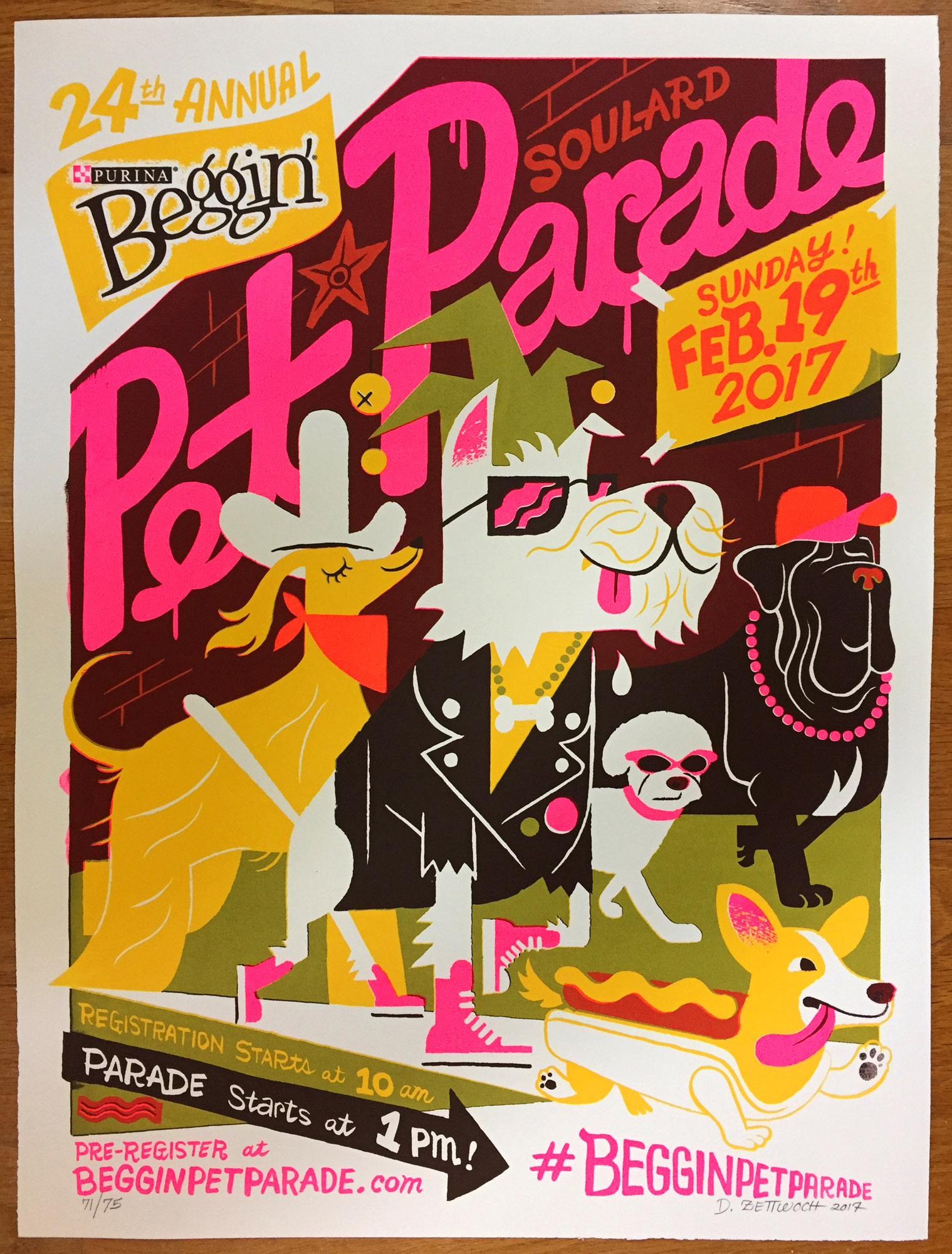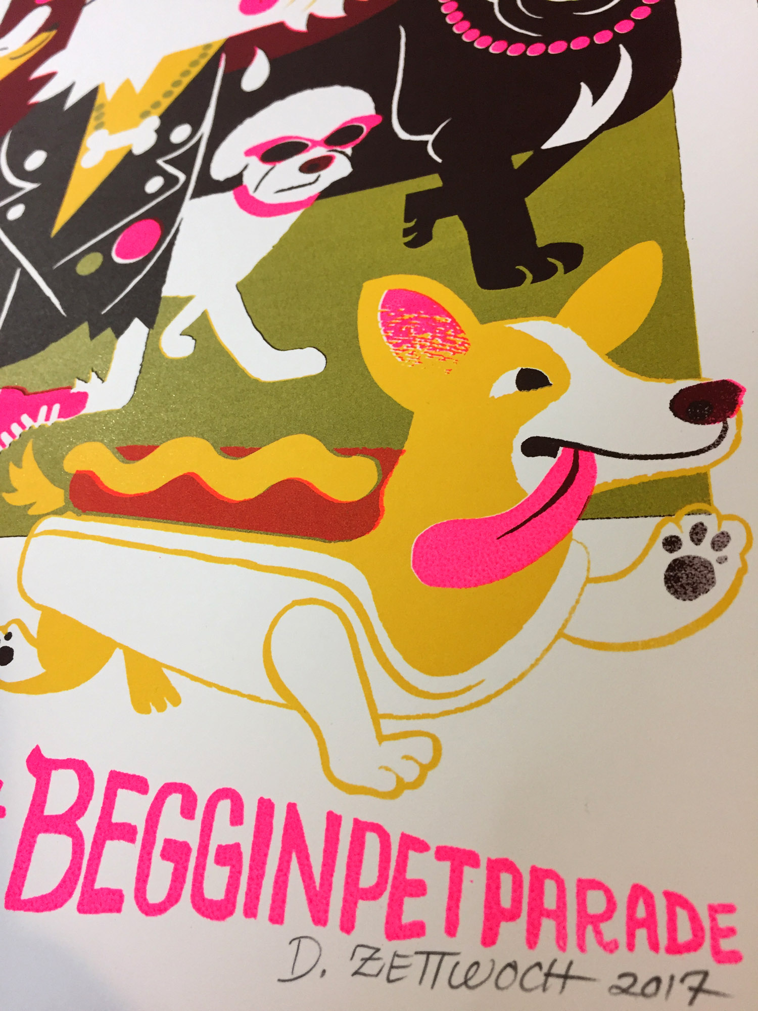 3-color hand-pulled screenprint for the 2017 Beggin' Pet Parade in the Soulard neighborhood of St. Louis. Dark brown, yellow, and flourescent pink ink on 18"x24" Canson antique white (250 gsm) paper.
