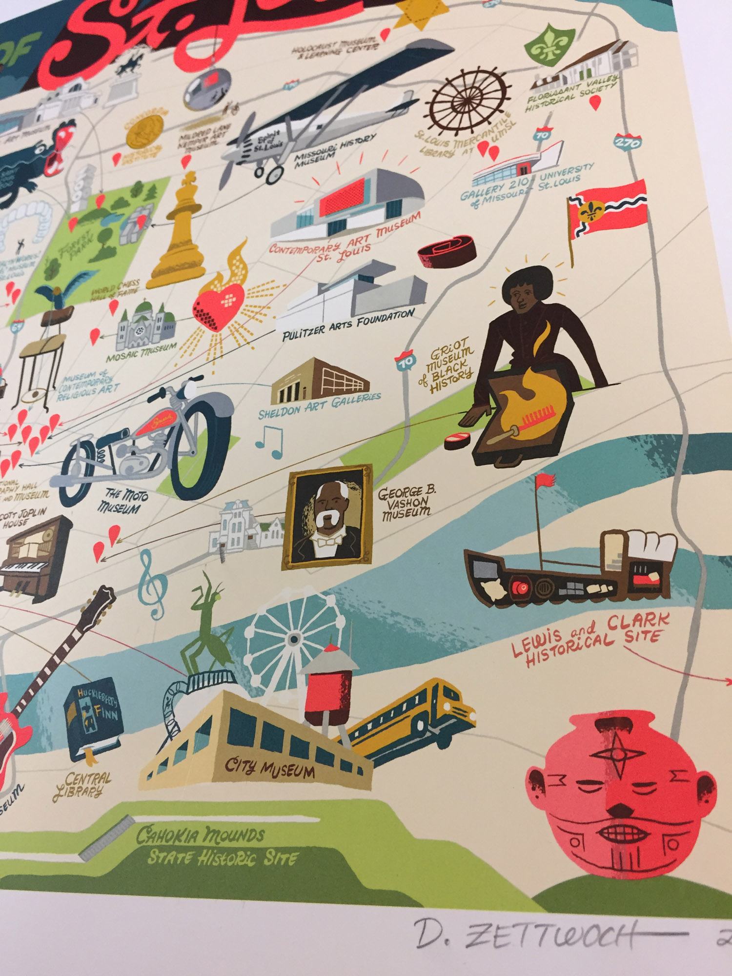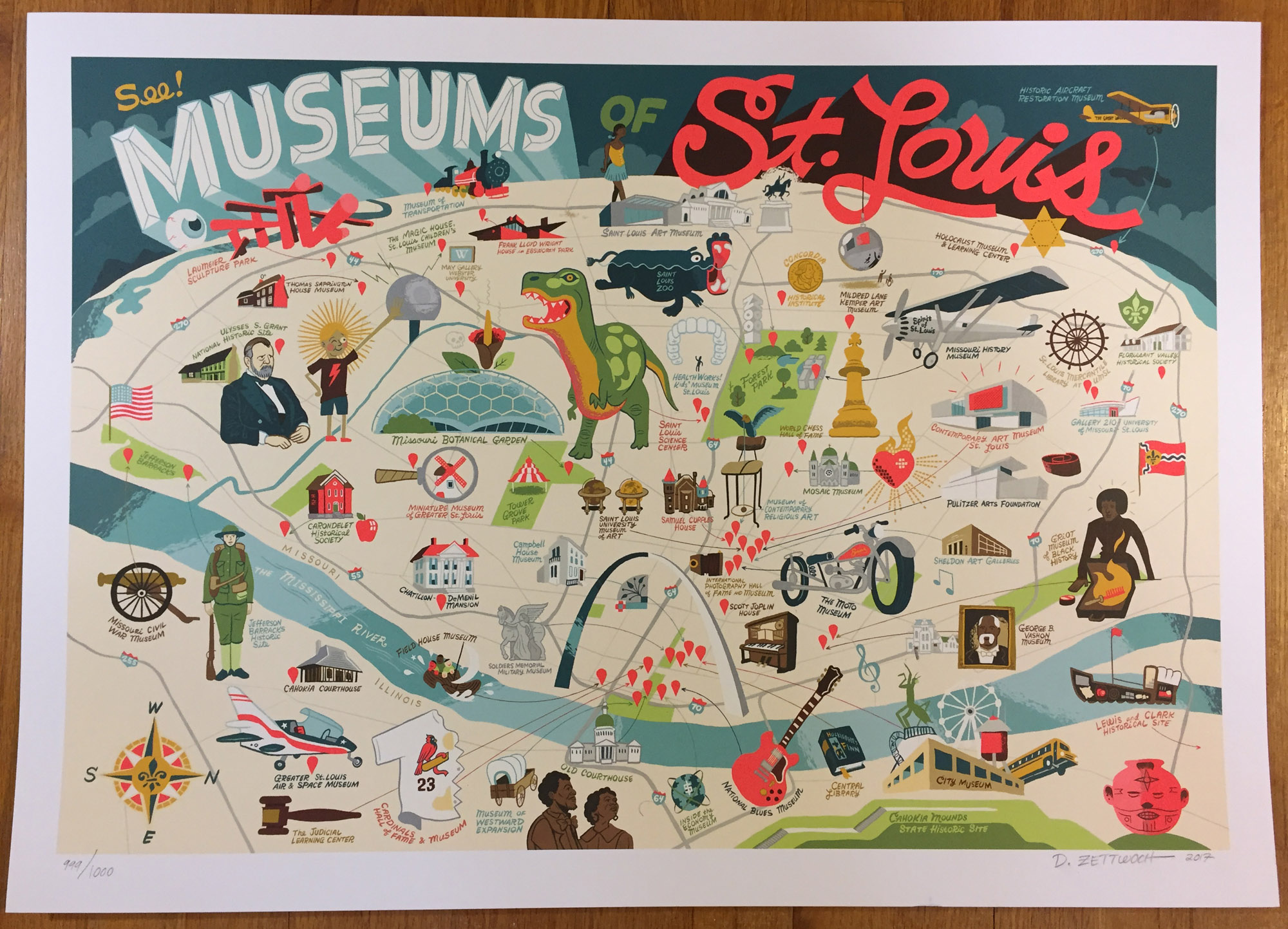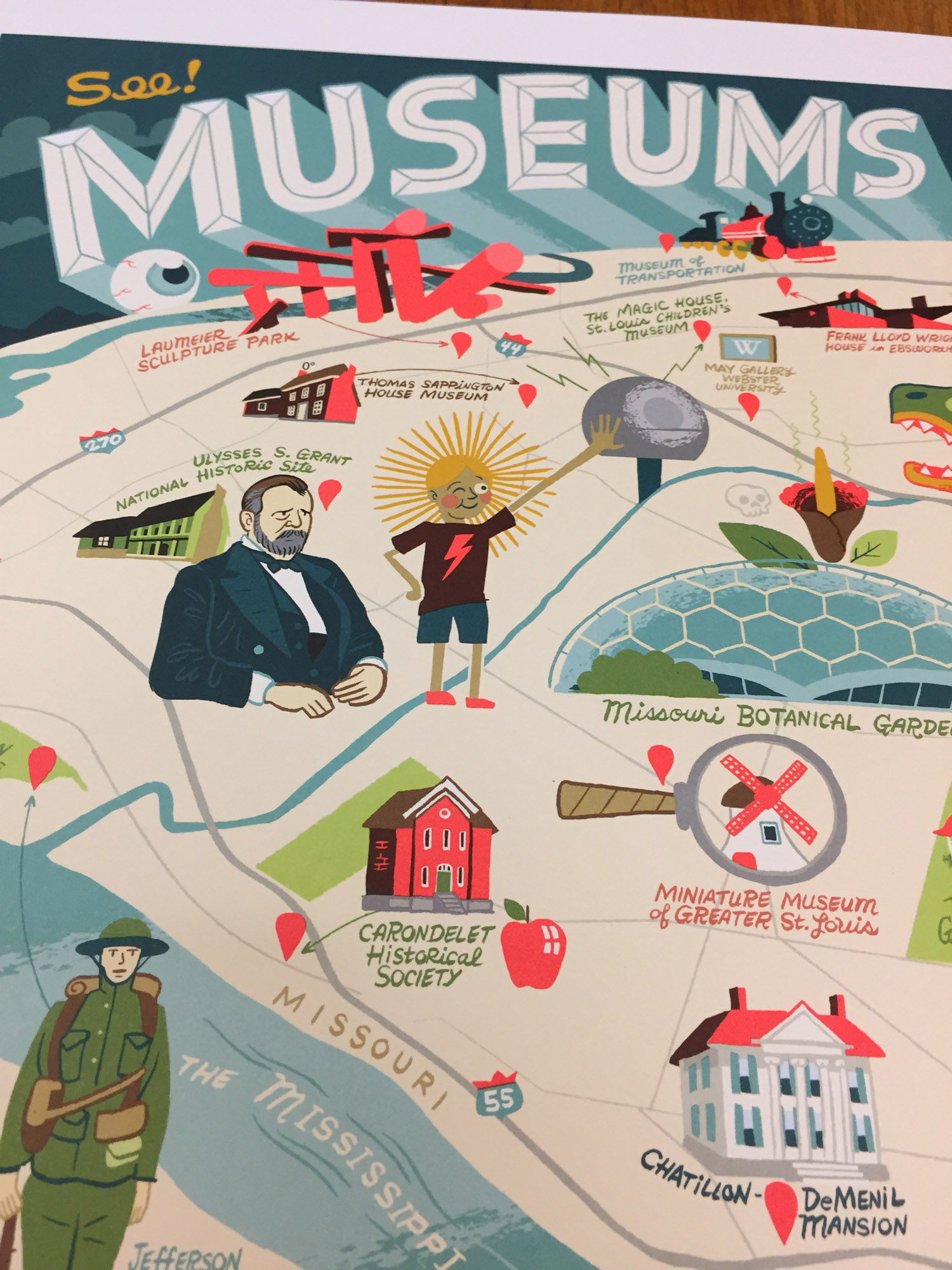 Six-color offset print showing all the wonderful museums of the greater St. Louis area. CMYK + fluorescent red and metallic silver on 28"x 20" heavyweight paper.