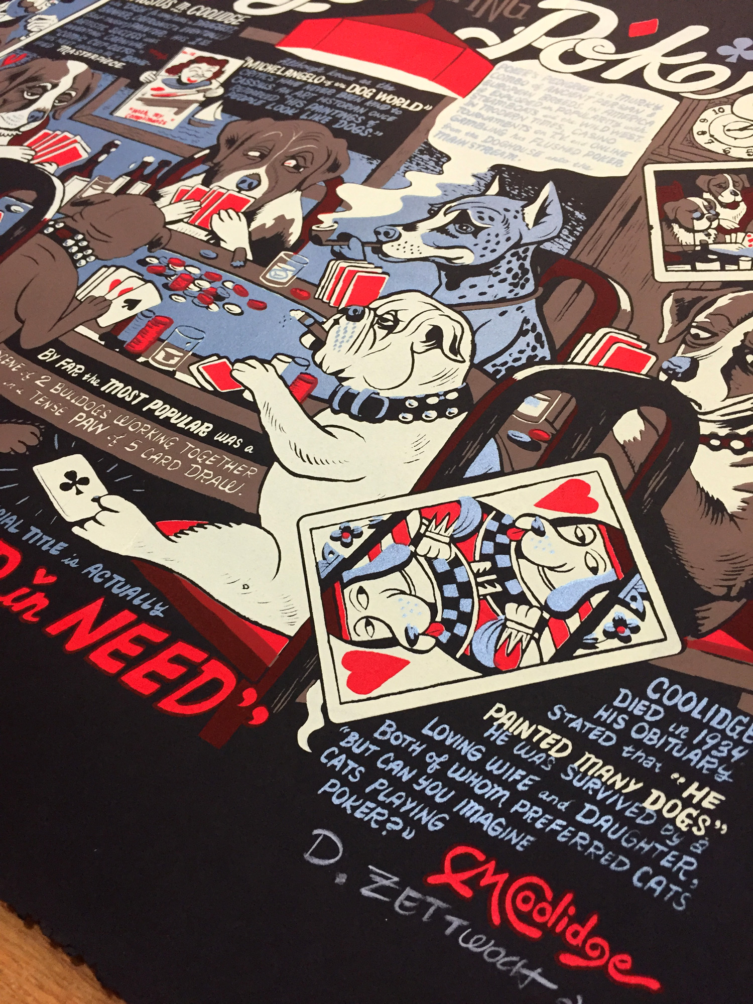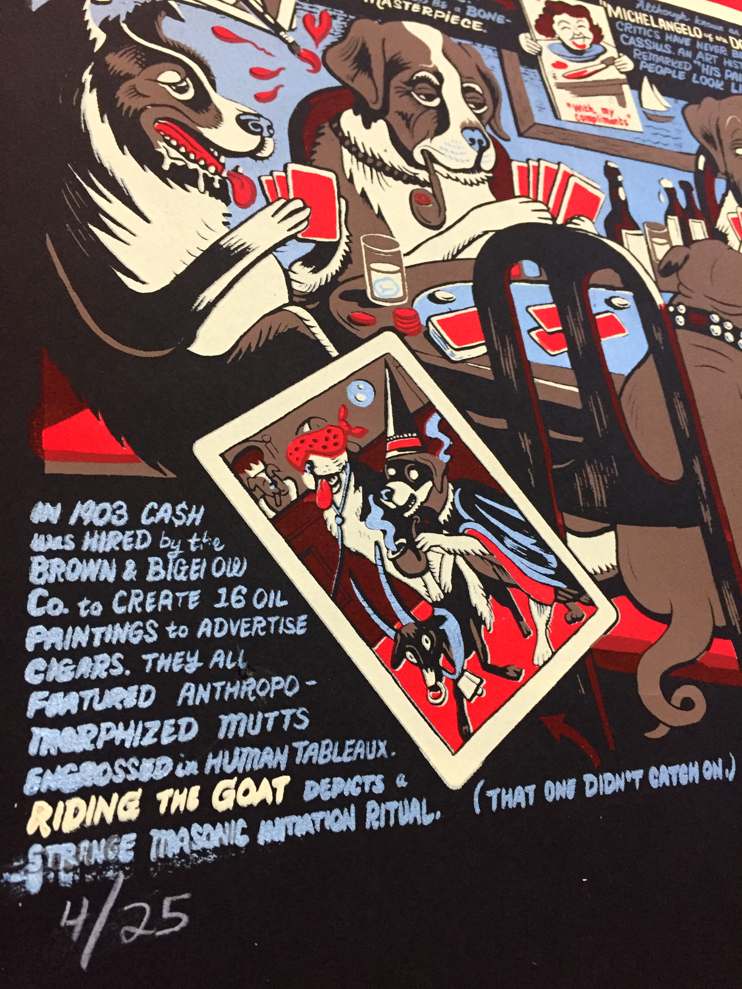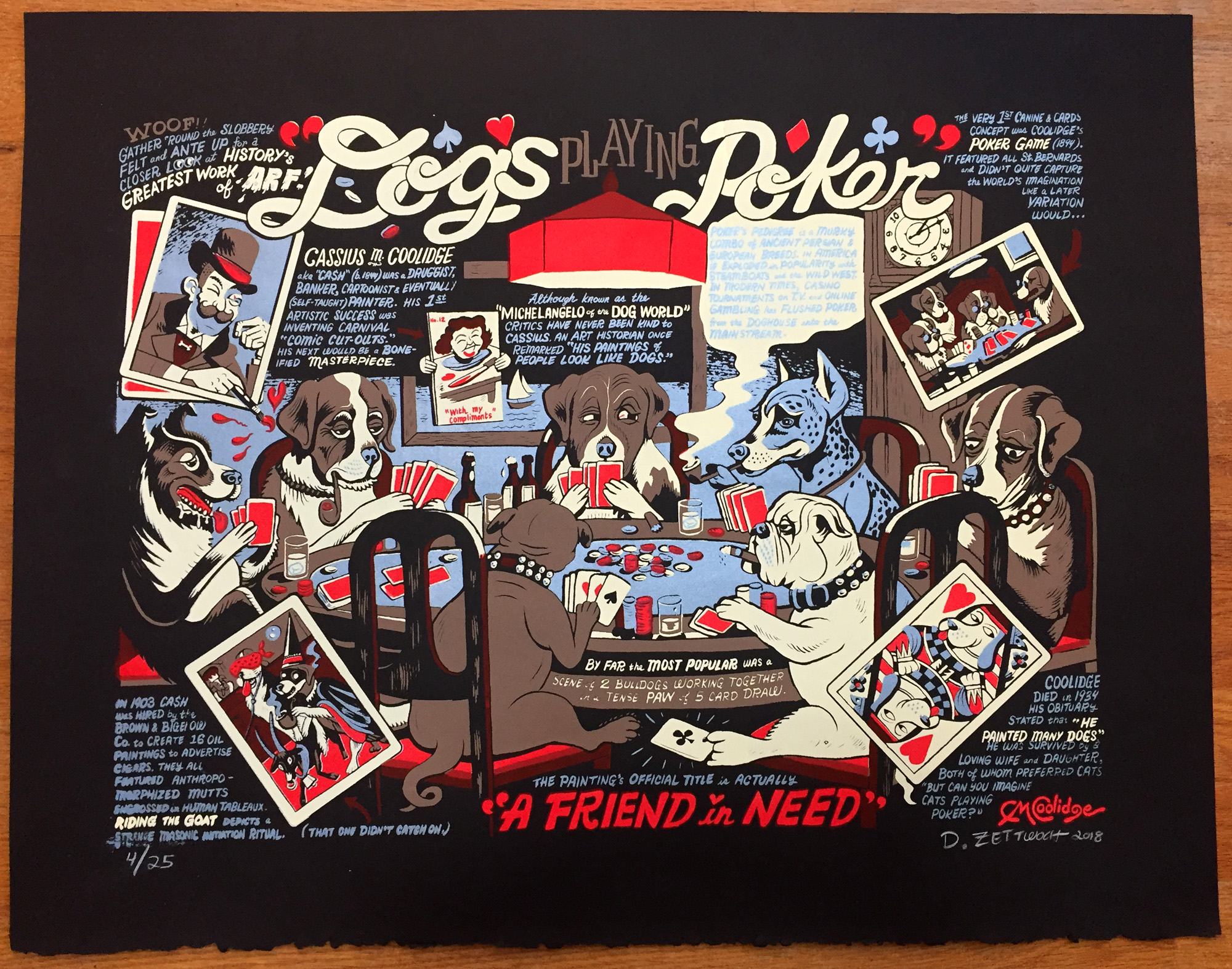 4-color hand-pulled screenprint dissecting the classic kitsch painting "A FRIEND IN NEED" by C.W. Coolidge. Off-white, brown, metallic blue/silver and red ink on black velvet-y 28"x22" Stonehenge (90 lb) paper.