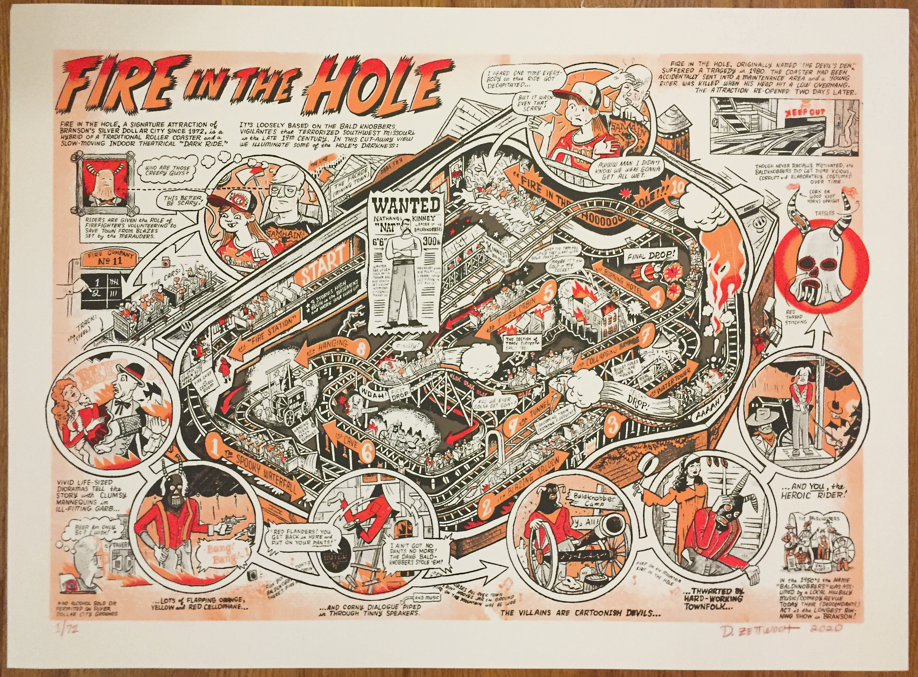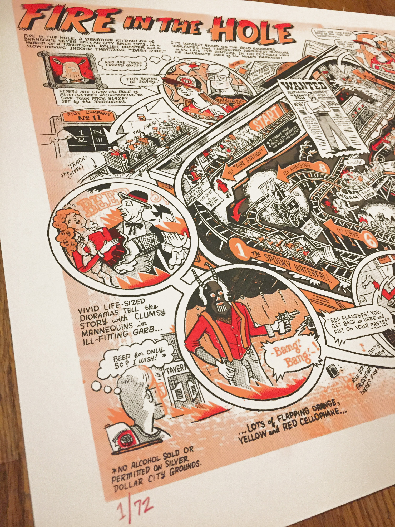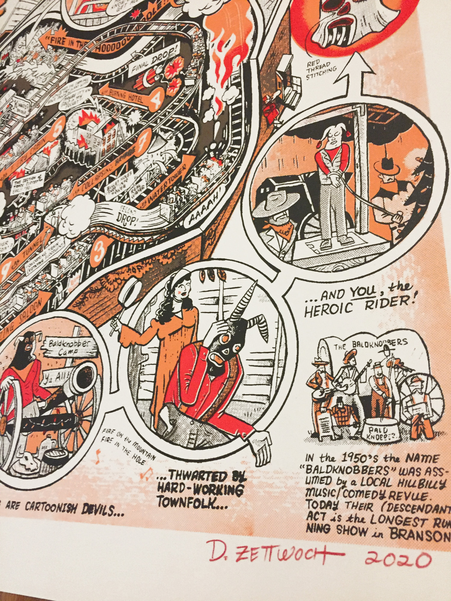 Big ol' 4-color screenprint diagramming + detailing my favorite Ozark roller coaster. Fluorescent salmon and red (brighter IRL), dark brown and gray inks on 250 GSM Fabriano Unica Ivory paper, 30 x 22". Edition of 72.