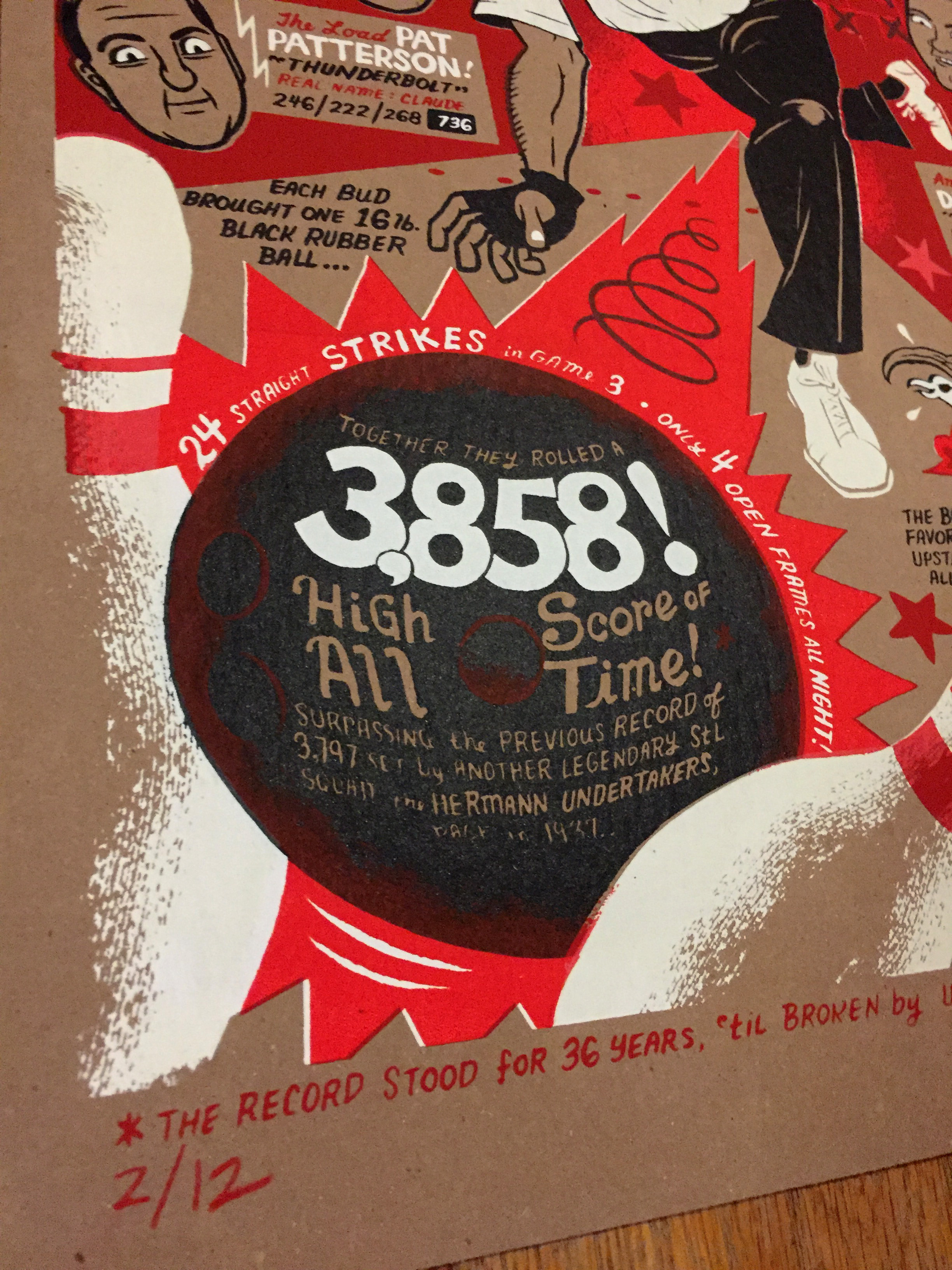 New small edition of this striking 4-color screenprint highlighting the Best Bowling team's Best Night. White, Red, Black and Glo-in-Dark-Ink on chipboard, 18x24".