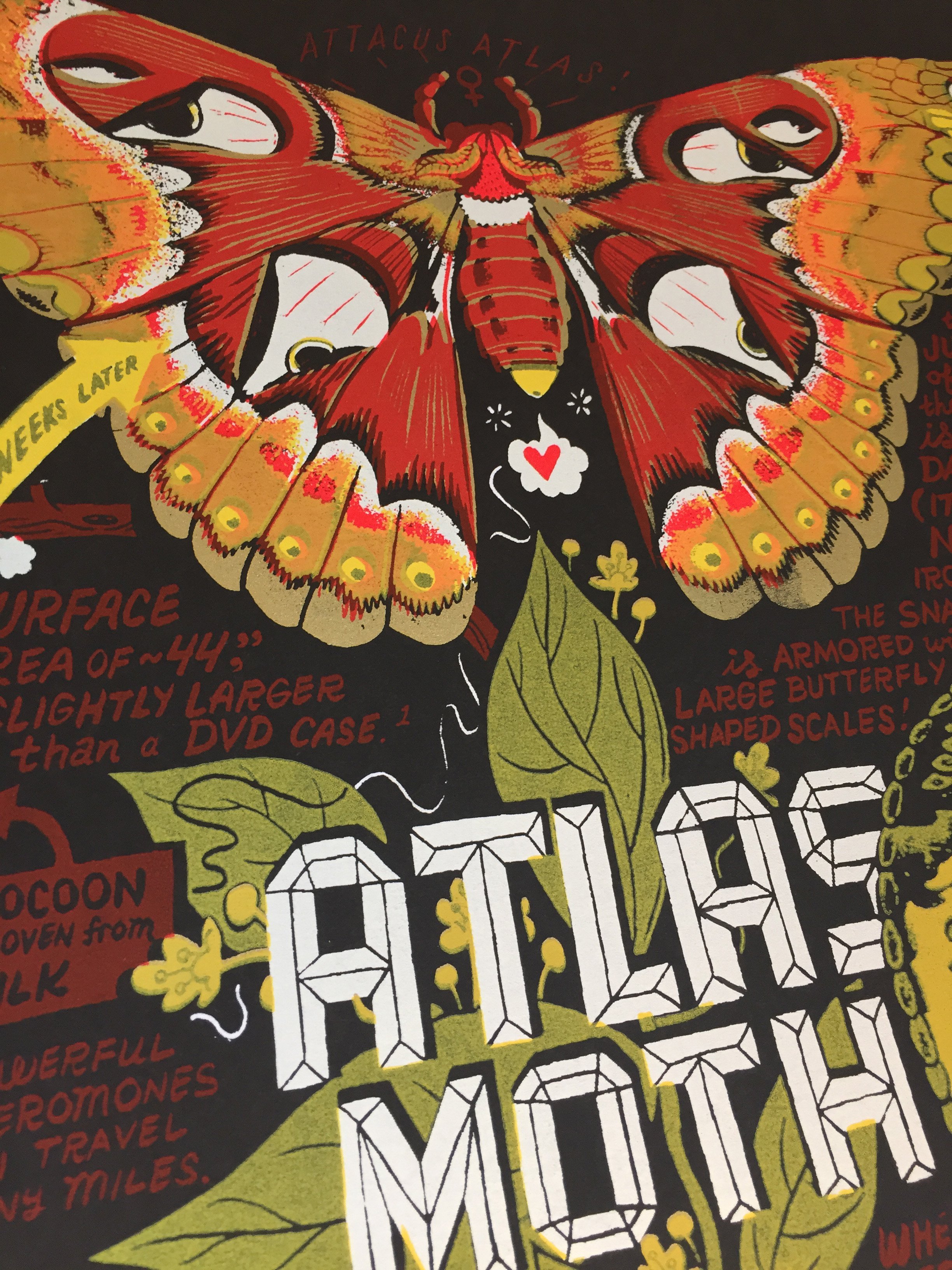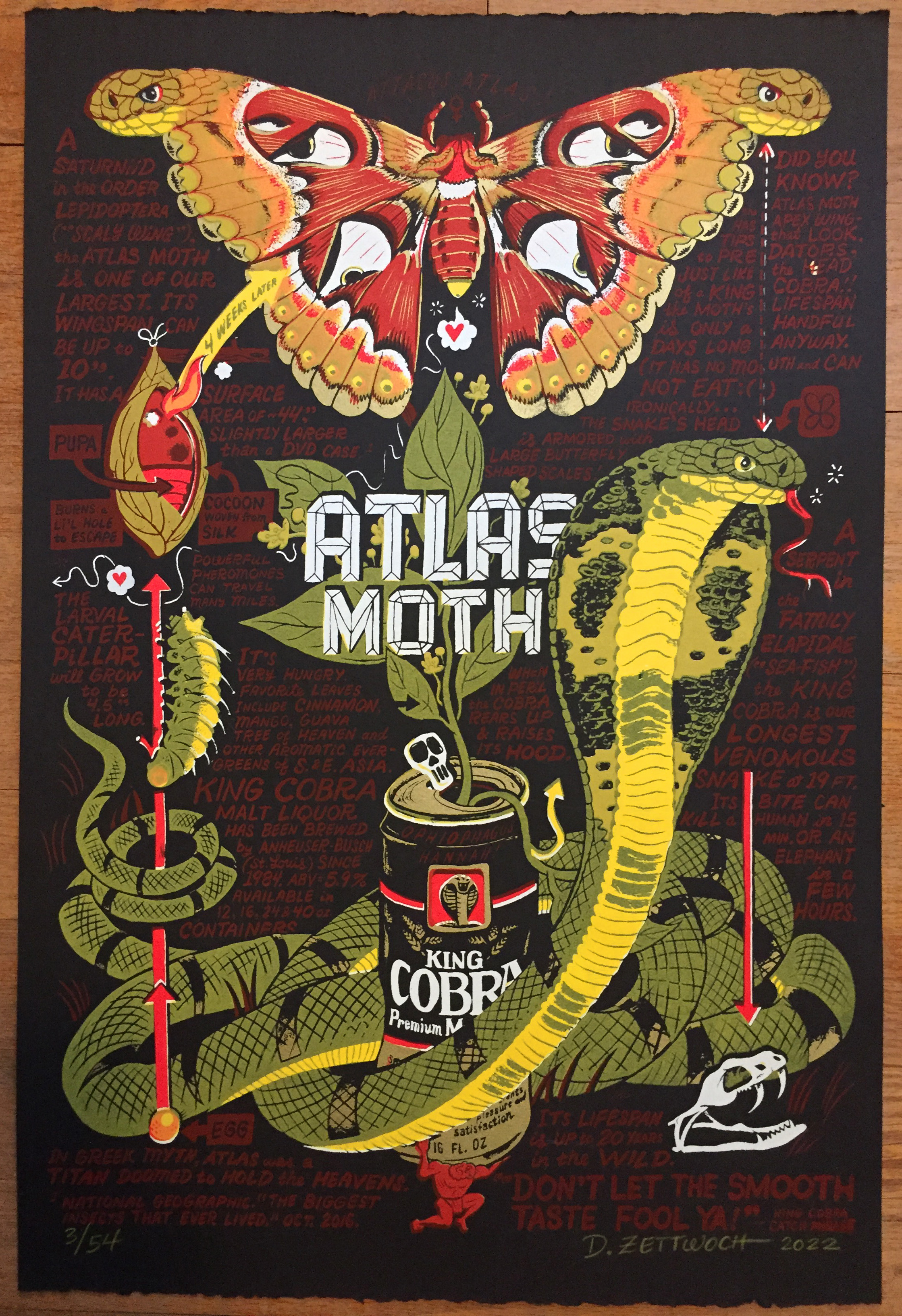 Four-color hand-pulled screenprint showing the relationship between the Atlas Moth (Attacus atlas) and King Cobra (Ophiophagus hannah). Off-white, metallic gold, red and yellow on black 90lb. stonehenge paper, 15x22". Edition of 54.