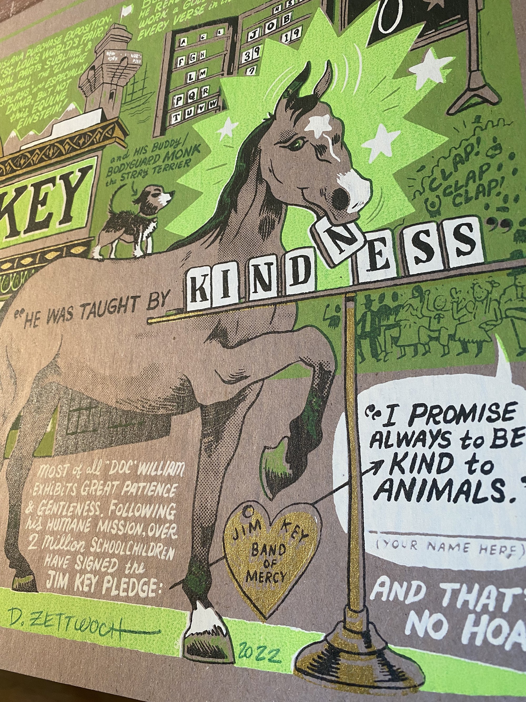 Four-color hand-pulled screenprint showcasing the "Most Educated Horse in the World" Jim Key (the most popular exhibiter on the Pike at the 1904 St. Louis World's Fair) and his compassionate teacher Dr. Wm. Key. More info here: https://zettwoch.blogspot.com/2022/12/new-print-beautiful-jim-key.html