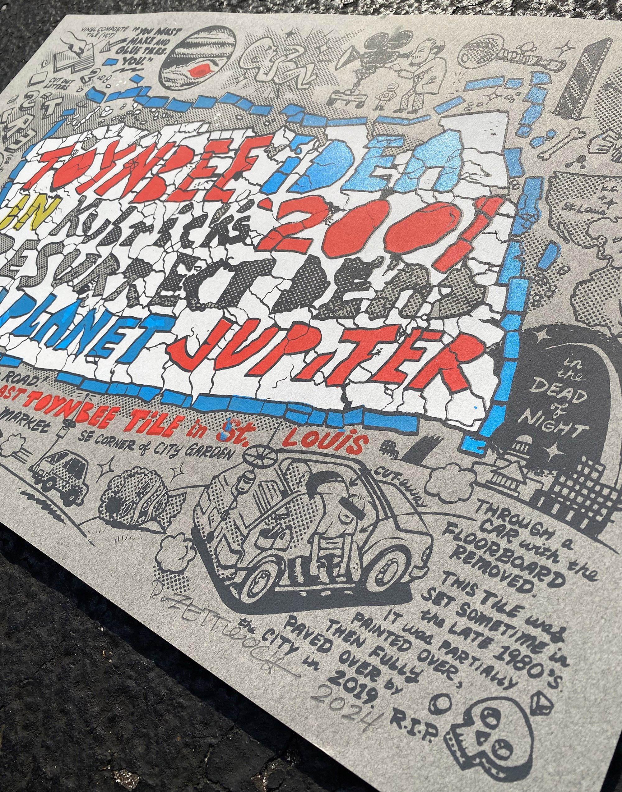 5-color screenprinted homage to the last "Toynbee Tile" in St. Louis (RIP), located downtown at 8th and Market. Asphalt gray, White, Bright Blue, Yellow and Jupiter Red hand-printed on 19.5"x 12.75" concrete gray paper. Around the edges of the tile is a short history of the mysterious tiler, along with a strictly theoretrical DIY guide to the process of creating and gluing your own piece of street art. Edition of 50.